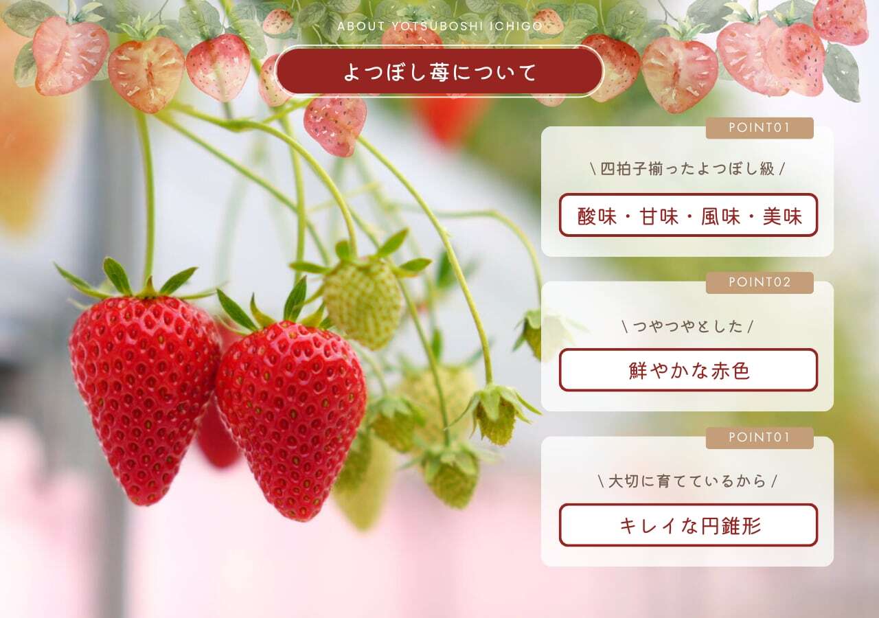 酸味、甘味、風味、そして美味しさ。四拍子が見事に揃った、まさに「よつぼし級」の美味しさを誇る苺。よつぼし苺は、積丹町の豊かな自然の中で、まるで我が子のように一粒一粒大切に育てました。手間と愛情を惜しまず注ぎ、ひとつひとつの苺が驚くほどの甘さと鮮やかな風味を持ち、食べるたびに笑顔になる苺です。